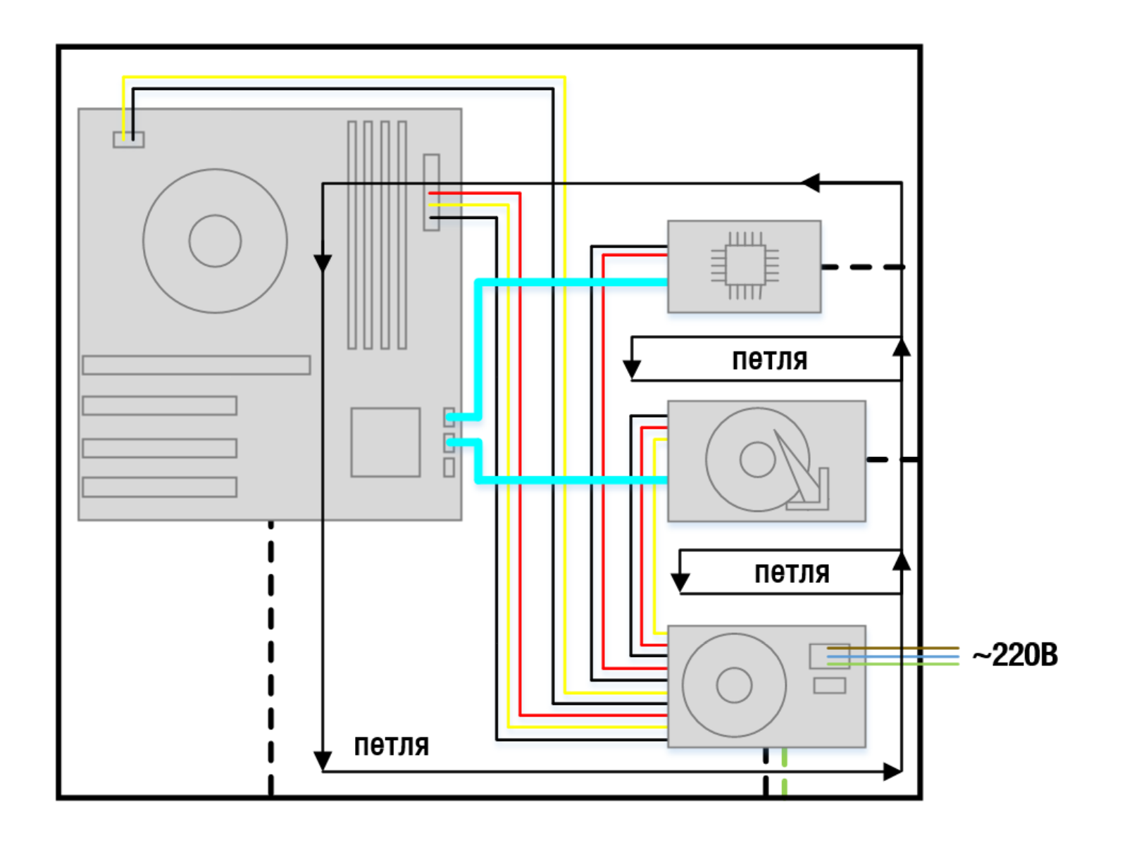 На схеме показано, как образуются земляные петли между комплектующими ПК.